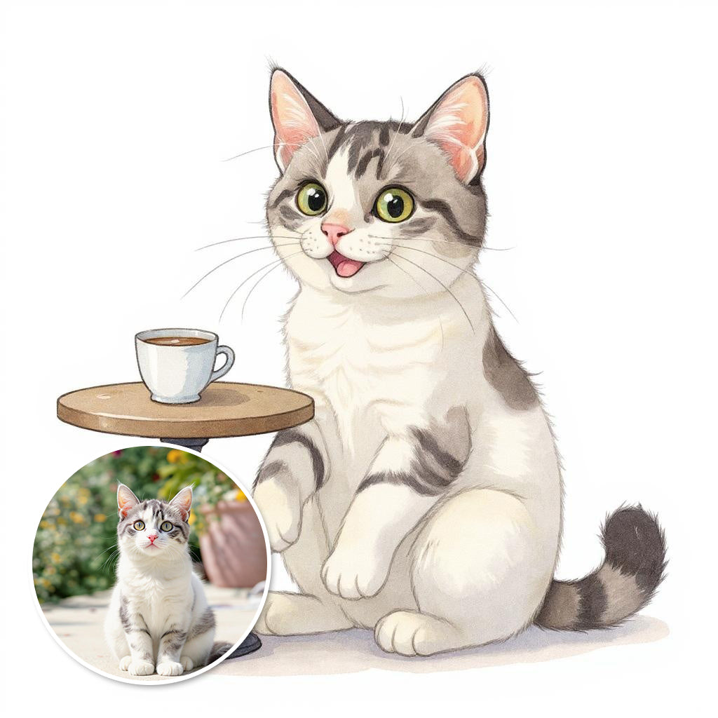See the magic happen in seconds! Watch your favorite pet or person become the cutest cafe patron.