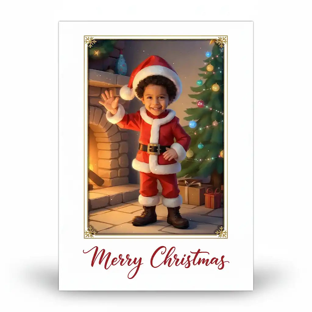 Send a holiday greeting that's truly one-of-a-kind! Our "The Junior Santa" personalized card turns your favorite person's photo into an adorable, stylized character, placing them right into a cozy Christmas scene.