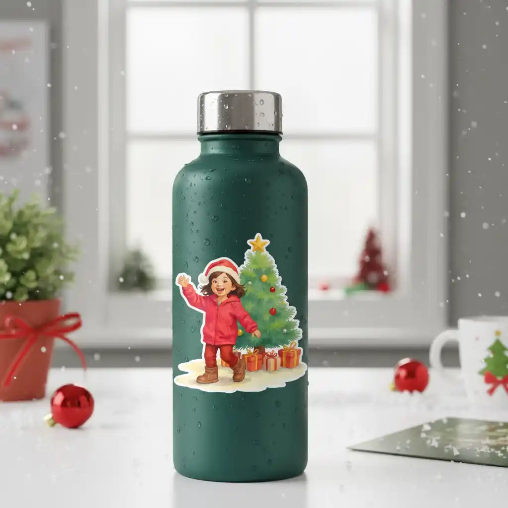 In our unique art style, we capture their jolly spirit as they wave hello, eager to make spirits bright. This durable, easy-to-peel sticker is perfect for decorating laptops, water bottles, notebooks, or holiday cards.