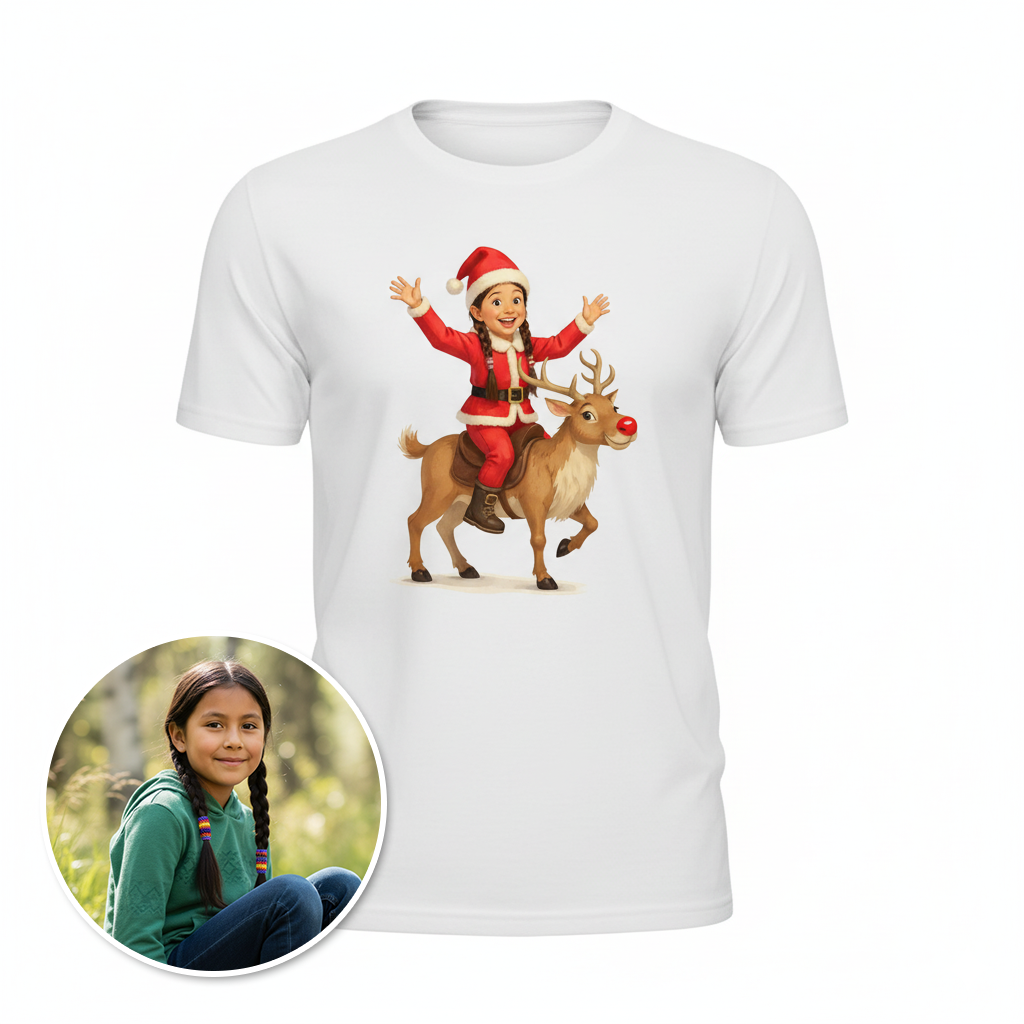 Our "The Reindeer Rider" t-shirt turns your favourite person or pet's photo into an adorable, stylized character, all set to spread some serious holiday cheer. We'll get them decked out in the classic red suit and hat, hopping aboard their very own festive reindeer for a jolly ride!